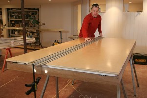 After the quick set up, I was ready to make some cuts. I had some cabinets to build for a current project, so I started by ripping several full sheets of pre-finished maple plywood to width.