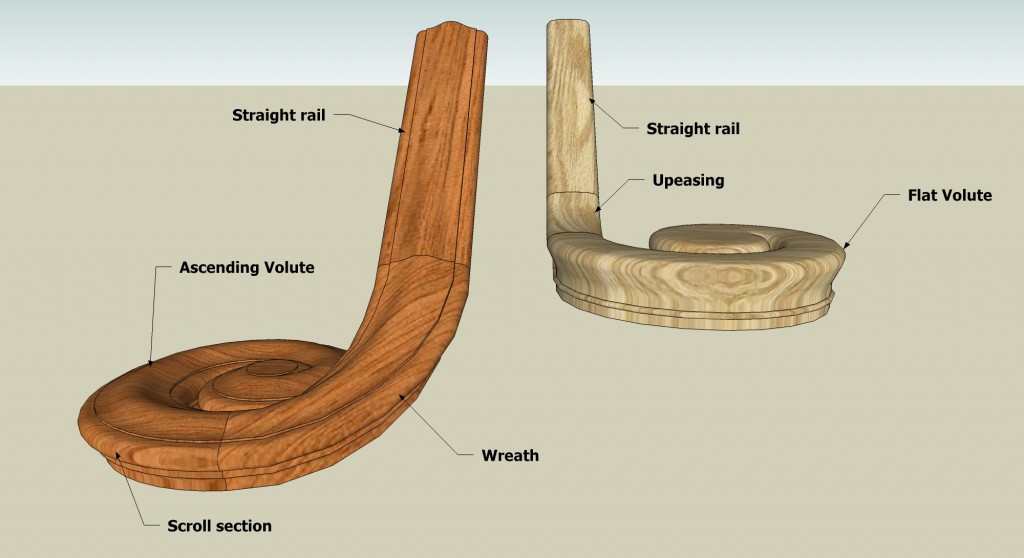 While learning to build stairs, one of the biggest problems I encountered was how to make a volute. What is a volute?