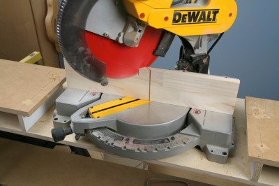 1. Cross cut the material. Rip or buy a short piece of material the same height as your miter saw fence. Cut the material the same length as your saw, measured all the way from one side of the saw to the other.