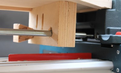 As a grip to move the rods in and out of the rails, I made some wooden knobs, drilled them to accept the rods, and placed a set screw through each knob to hold the rods to the knobs.