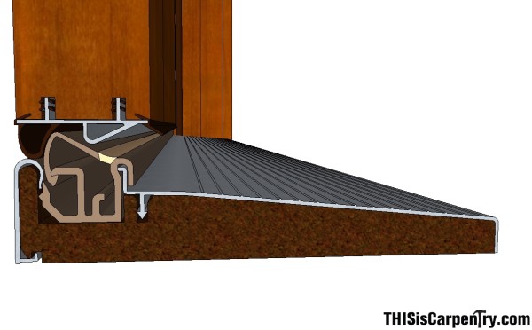 Interlock thresholds are always the best way to go, if you want a 100% positive seal—a door that never leaks. It’s easy to add a thin strip of silibead to the interlock J-hook, too, so wind and air can never penetrate the opening. But interlock thresholds aren’t easy to install. Plus, if anything settles, the J-hook can hang up and drag on the threshold.