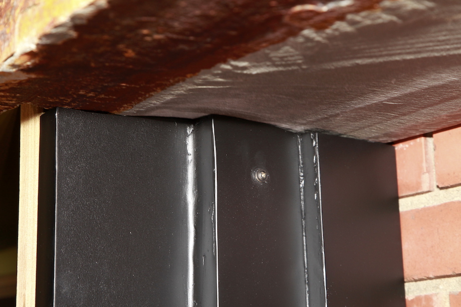 Once the fit was tight, I fastened the jambs to the cabinets using round head screws, which we also painted black. |