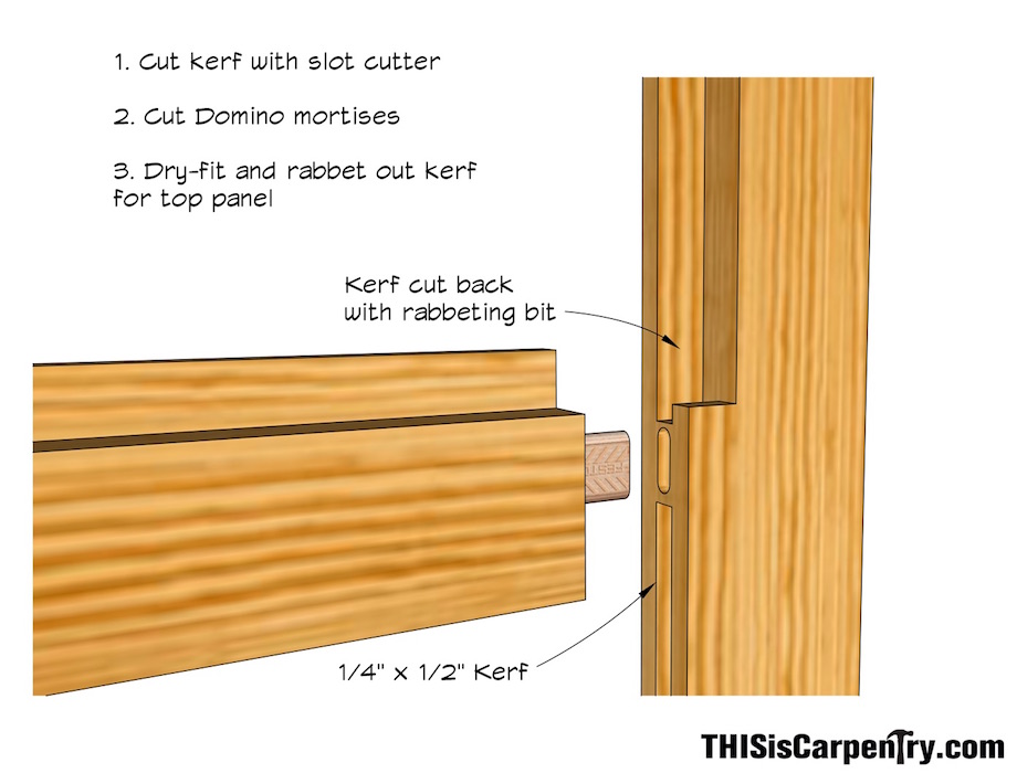 I used Domino tenons to secure the stiles and rails. I learned the hard way that the Domino mortise had to be cut after cutting the 1/4-in. slot, otherwise the bearing guide on the slot cutter could fall into the Domino mortises. I tried my best to stop the 1/4-in. slot cutter at each rail, which wasn’t so tough at the bottom and top rails, but at the mid-rails, sometimes the Domino mortise was cut right through the slot. Fortunately that didn’t matter—the 5m x 30m Domino tenons penetrated deeper than the slot, and the mortises were wider, too, so the tenons still fit snug.