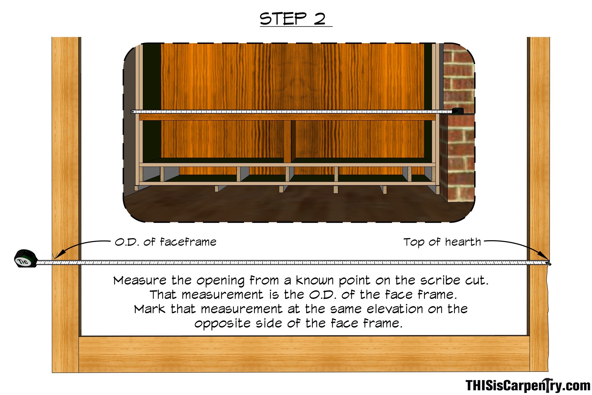 Next I measured the exact width of what would be the finished frame—measuring from the very top of the hearth, on a level line to the wall. I then marked that measurement on the face frame, hooking my tape measure on the cut scribe line.