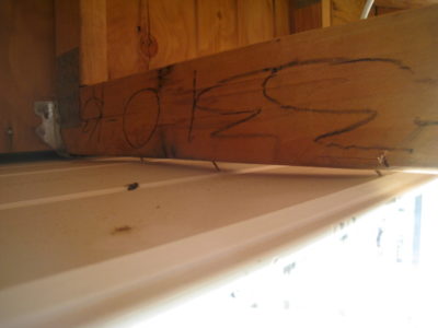 | The bottom cords in this patio roof dried out and lifted off the joist hangers, pulling the fasteners out of the ceiling boards. | ![]() |