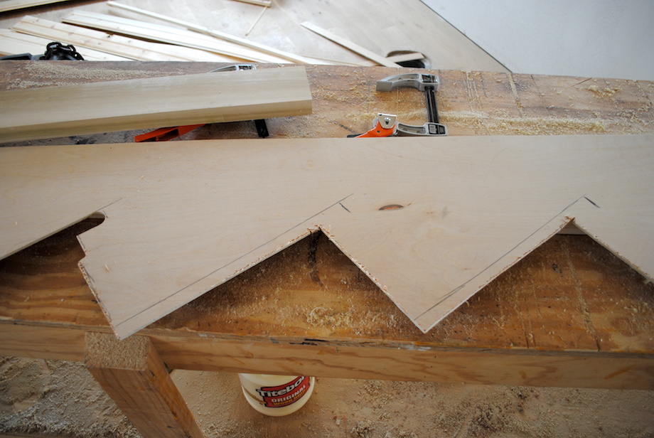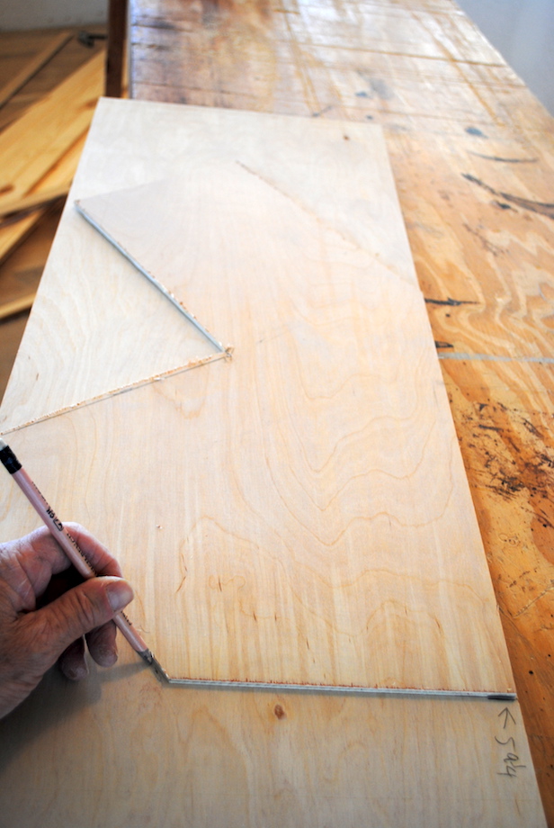 For some reason on this job I started at the bottom and worked up, so for my top pieces I made a template of the cut, put it in place, and then measured from the end of the template down to the lower plywood layers to get a total length (hopefully you will be smarter than me and just start at the top).