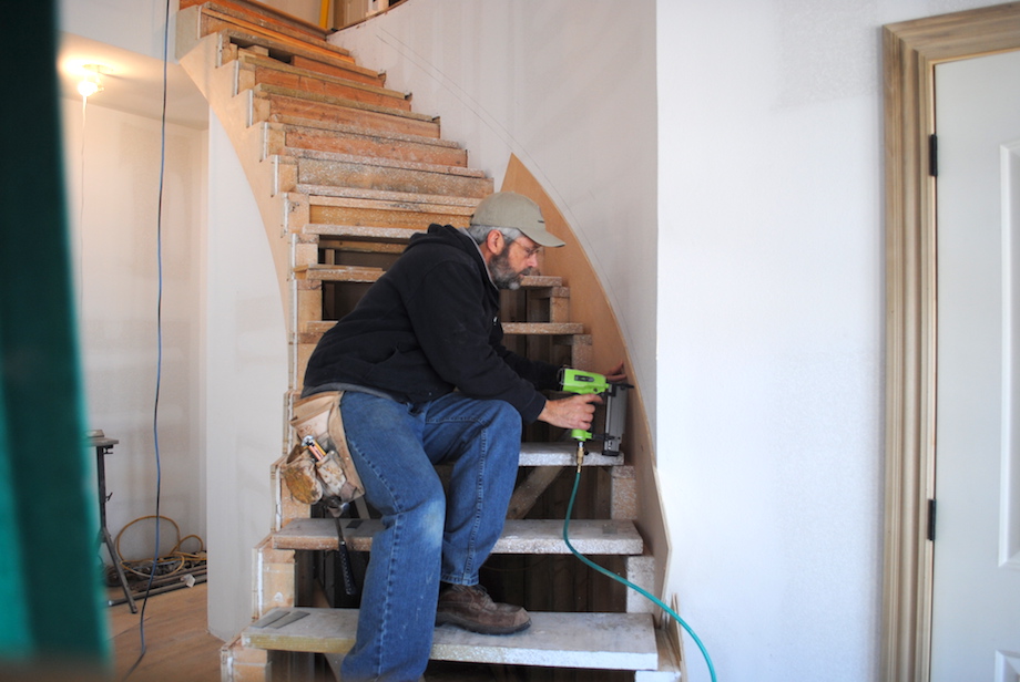 One of the most important things for me on any stair job is that you don’t hear any squeaking when you walk up and down the stairs. Squeaks occur when a tread moves and rubs on one of the fasteners or another part of the stair. To set a tread properly it just takes a few shims, a lot of construction adhesive, and some trim head screws.