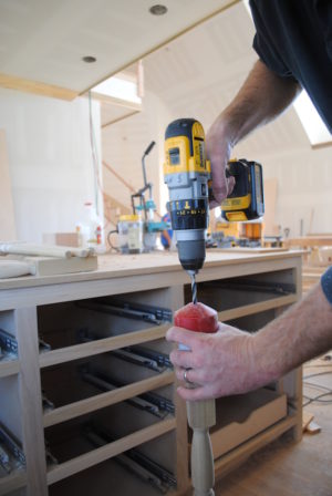 It’s a good work out for your forearms! Sometimes we make a box out of plywood with a handle on top for leverage to slide over the balusters and spin them in place, but if you have enough help spinning them in by hand is faster. Sometimes you have to double up to get that last 1/8-in. turn to line up the baluster.